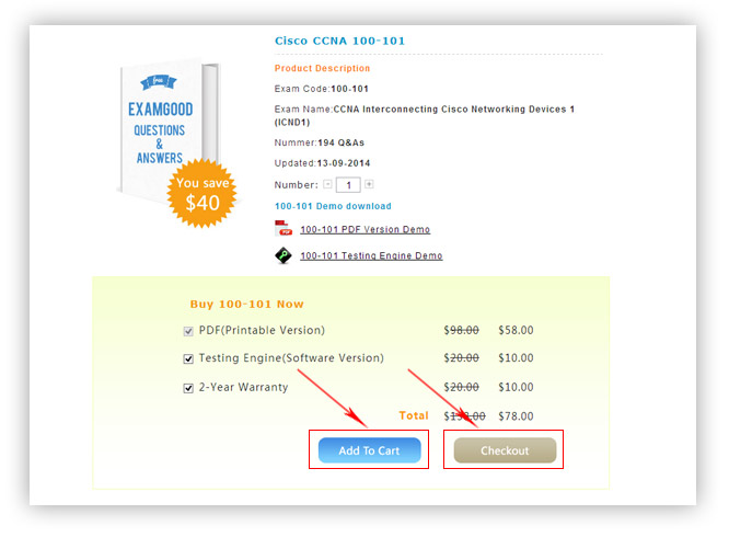 4.Through "Search"or " Products" to find the exam which you need. At this step, you can choose the options “Testing Engine” or “2-Year Warranty” according to your requirements. After you confirm that well then click the button "Add to cart" to add our product to the cart.