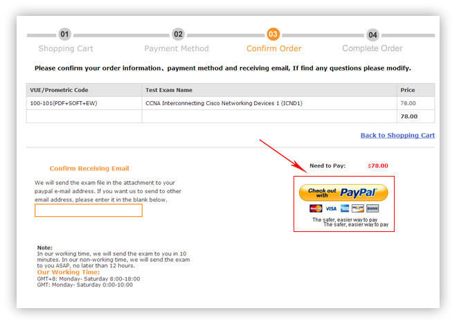 5.In this page, please confirm the exam name and code carefully. You have three ways to get the discount. First, if you have the voucher you can use it directly as the picture showed then click " Use Voucher". Second, you can type our discount code in the Coupon blank and click "Use Coupons". Third, you can use the bonus points you have. At last, you should click the button "Confirm the order and to pay" into the next page.